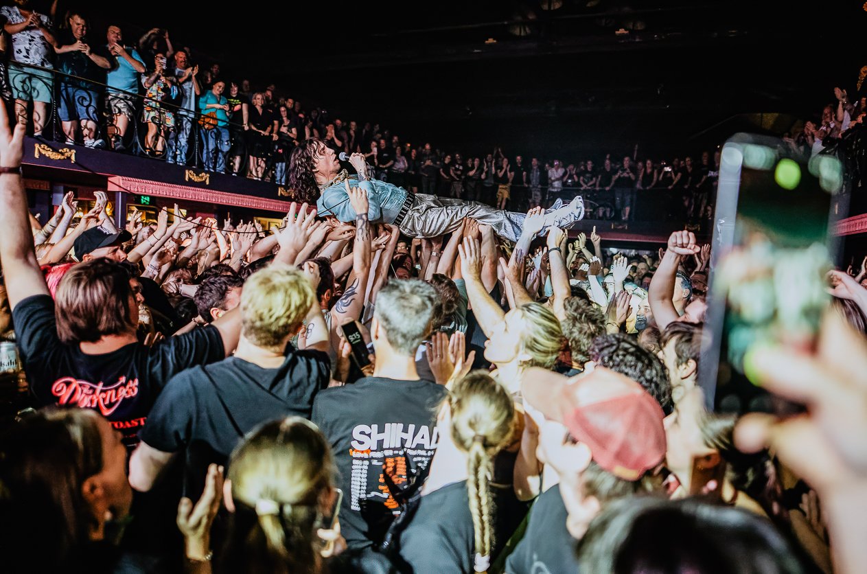 On his return to the stage, he told the crowd about how at their last gig at the Tivoli in 2024 he had jumped off the balcony and broken a rib. “It bloody hurt – so I need soft hands over there to catch me,” he explained. “But I have one request. Everybody put your phones away, let’s just enjoy this time and moment together! But if I do anything amazing – make sure you record it!” Then, the crowd chanted for him to re-enact the jump: “Do it again!” was the call. And he did it again. Justin Hawkins left the stage, climbed the stairs, and launched himself off the mezzanine balcony into the crowd and surfed back to safety – no broken rib and triumphant!