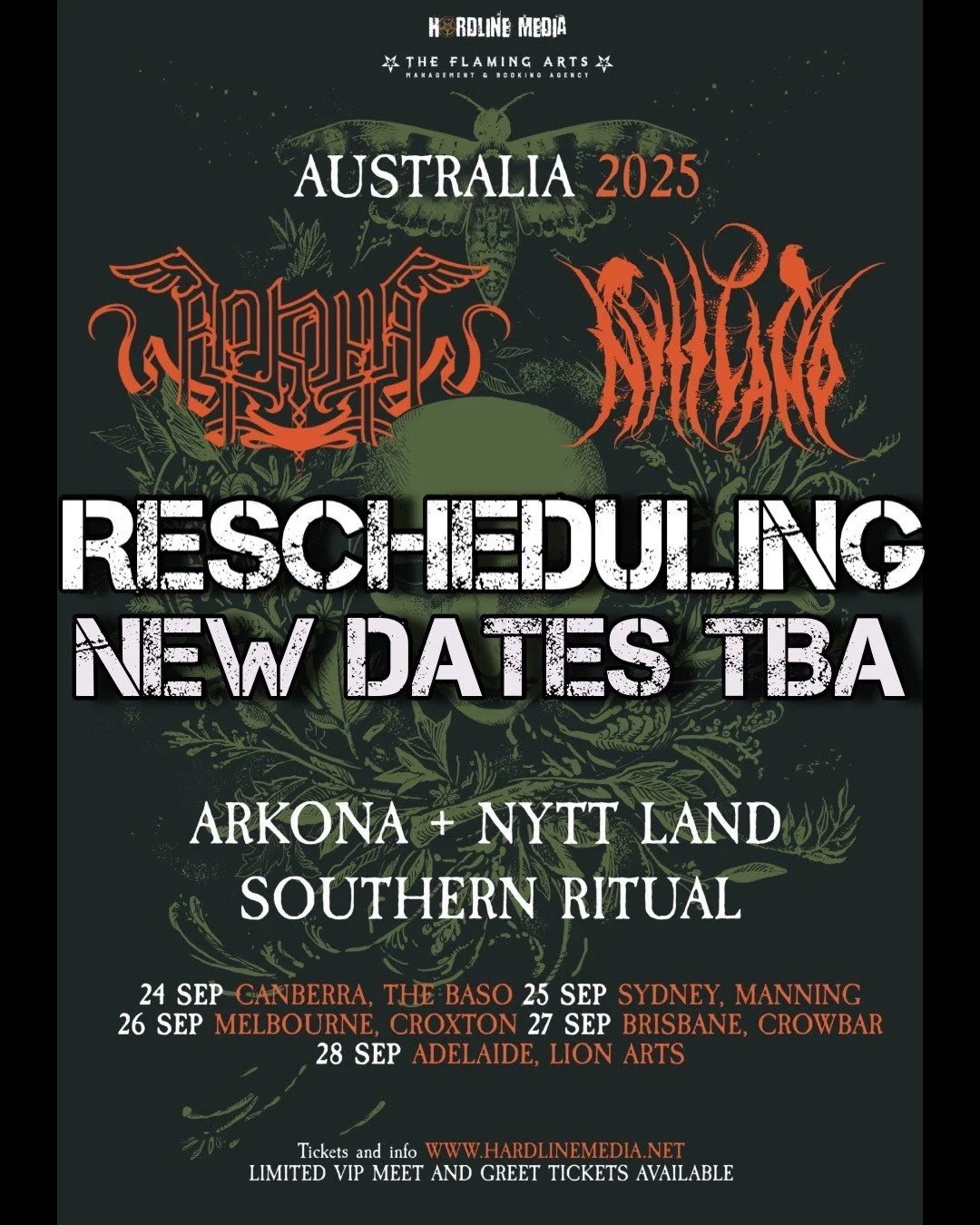 Please note, these are NOT being cancelled, all of Nytt Land's shows internationally are being rescheduled until air travel is safe again for him and he is fully healed. Please be patient as we work out new dates for The Southern Ritual Tour.